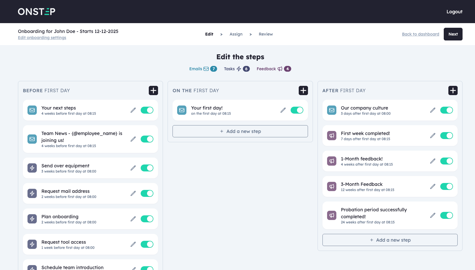 Our main focus has been to create an onboarding experience that does not end on the first day. We have designed easy-to customize templates that put the employee and feedback right on the center.